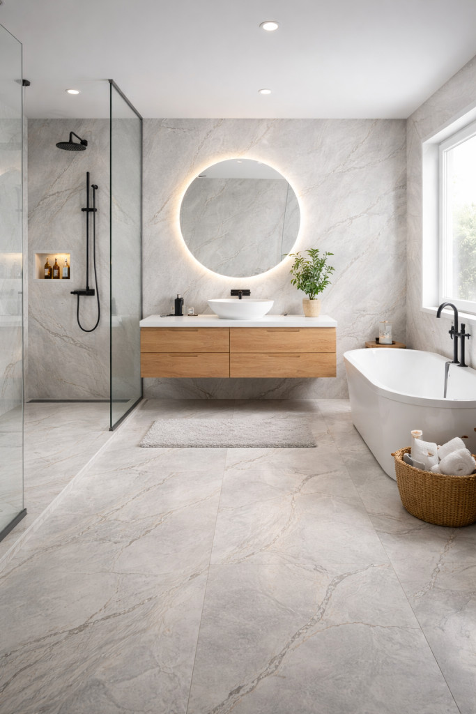 Ez az elegáns, világosszürke árnyalatú, finom erezettel rendelkező márványhatású gres porcelán lap tökéletes választás modern és időtálló fürdőszobák, nappalik és exkluzív terek kialakításához. A nagyméretű, 60×120 cm-es formátum letisztult, egységes felületet eredményez, minimalizálva a fugák számát, ezáltal tágasabb térérzetet biztosít.