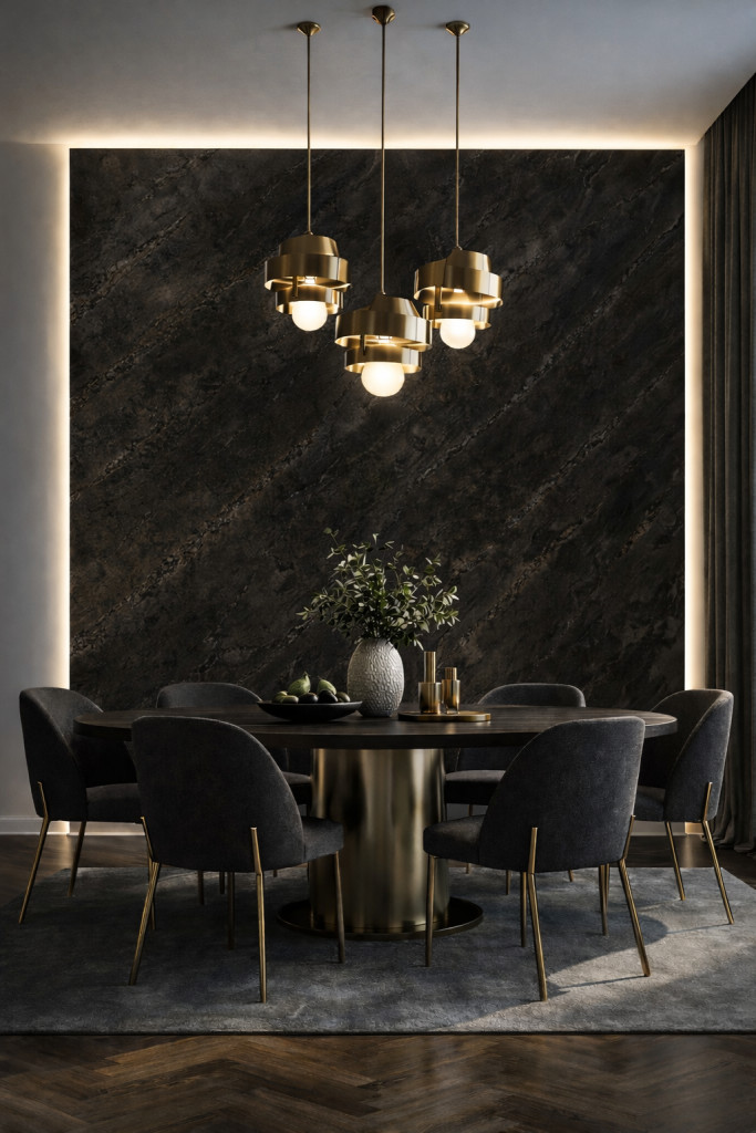 A 600×1200 mm méretű SPC falpanel elegáns sötét kőhatású mintázatával modern, karakteres és exkluzív megjelenést biztosít a belső terek számára. A mély, természetes kő textúrát idéző design különleges atmoszférát teremt, miközben a matt felület visszafogott, prémium hatást kölcsönöz a falburkolatnak.