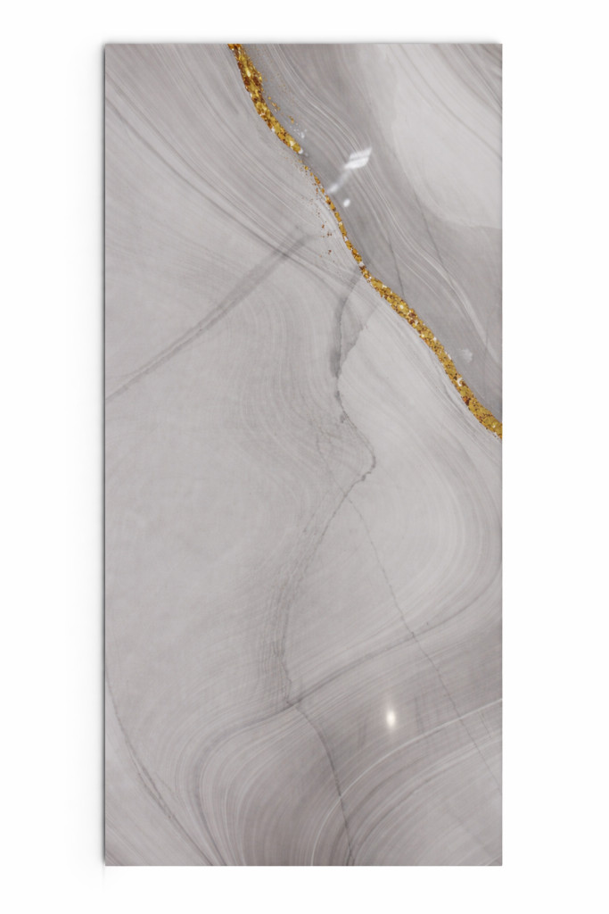 Modern luxus egyetlen nagyméretű táblában. A 60×120 cm-es SPC falpanel elegáns szürke márvány mintázatával és karakteres arany erezetével exkluzív, mégis letisztult megjelenést biztosít nappaliban, hálóban, előtérben vagy akár üzleti enteriőrben is.
