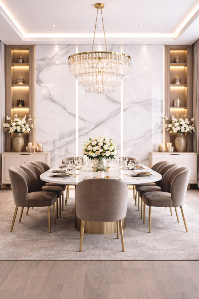 A fényes felület visszaveri a fényt, kiemeli a márvány erezetét, és tágasabb, világosabb hatást kölcsönöz a térnek.