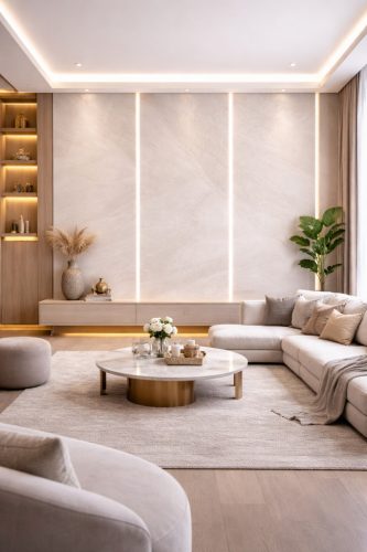 A világos bézs tónus optikailag tágítja a teret, miközben meleg, harmonikus hangulatot teremt. Rejtett LED világítással kombinálva különösen látványos, mégis elegáns fókuszfal alakítható ki.