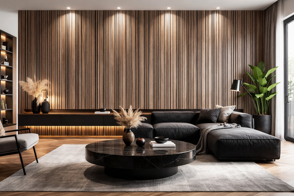 Karakteres, mély tónusú falburkolat, amely azonnal elegáns, exkluzív atmoszférát teremt. A sötét dió árnyalat és a vertikálisan tagolt lamellás kialakítás erőt, stabilitást és prémium minőséget sugároz.