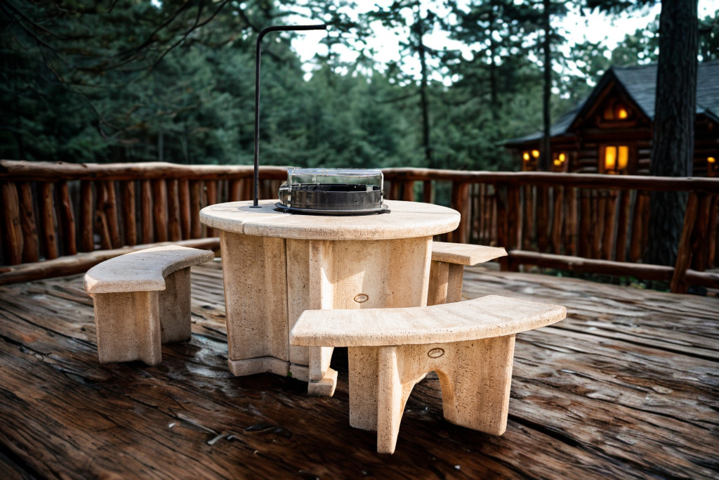 Kerti szalonnasütő, bográcsoló és grillező szett padokkal, kő hatású felületkidolgozással.