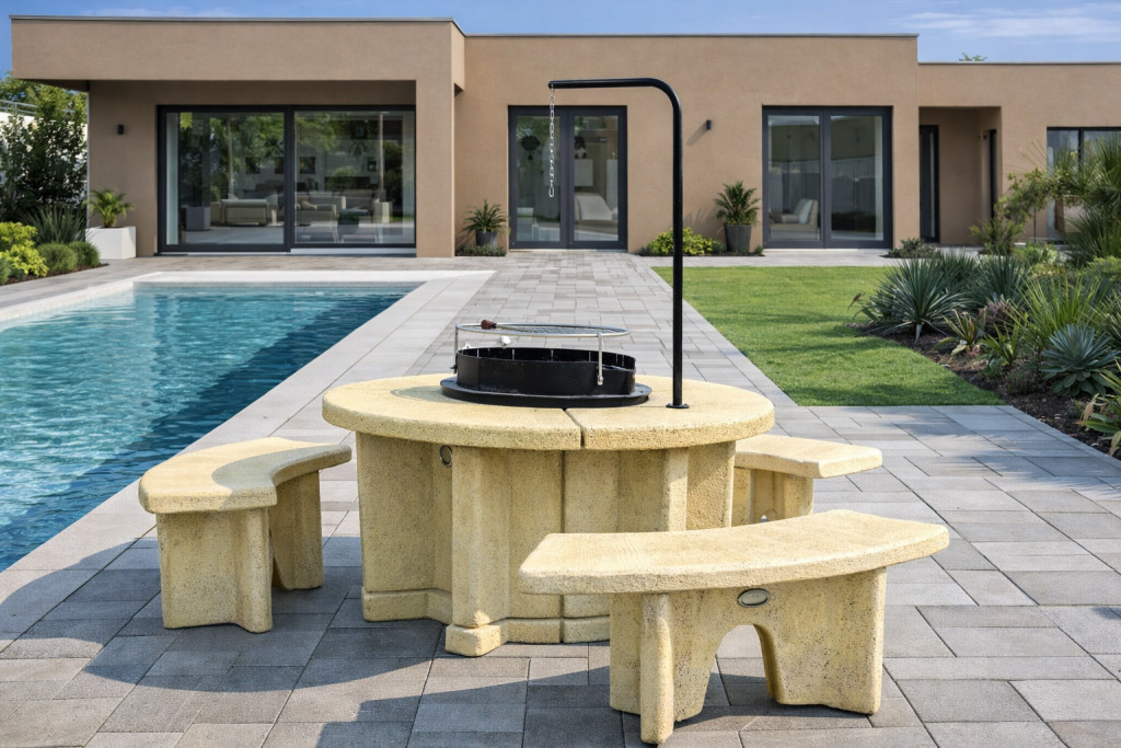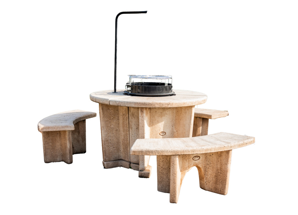 Kerti szalonnasütő, bográcsoló és grillező 3 db ülőpaddal, kő hatású felületkidolgozással.