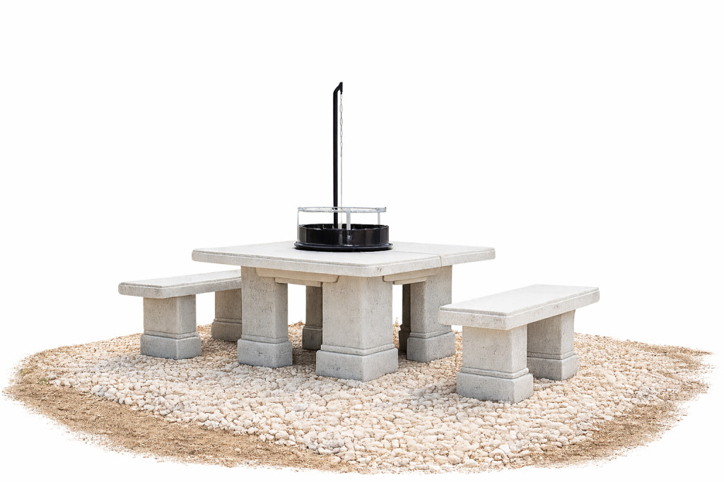 Kerti szalonnasütő, bográcsoló és grillező szett padokkal, kő hatású felületkidolgozással.