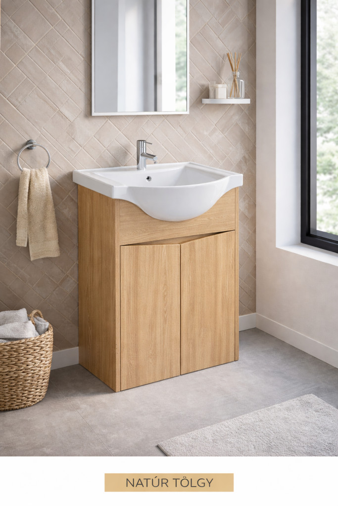 A Linzy 65 cm-es fürdőszobabútor ideális választás kisebb fürdőszobákba, ahol fontos a helytakarékos kialakítás és a letisztult megjelenés. A natúr tölgy szín meleg, természetes hangulatot teremt, miközben modern összhatást biztosít.
