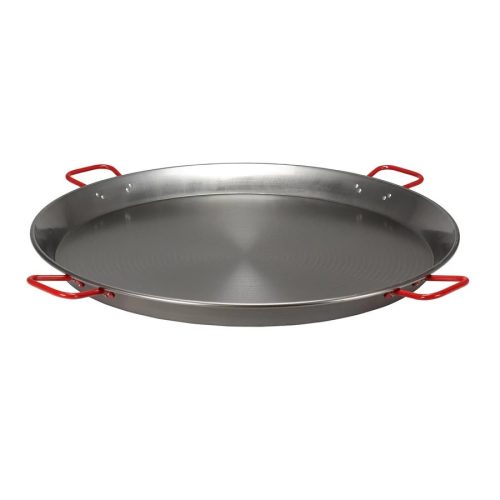 90 cm átmérőjű paella serpenyő, polírozott. Grillezéshez, főzéshez, besütött húsos, zöldséges ételek ételek elkészítéséhez. Használható nyílt láng felett, gáz- és elektromos tűzhelyen. A könnyebb tartás érdekében 4 db fogantyúval van ellátva. A serpenyő könnyen tisztítható neutrális, folyékony mosogatószerrel.