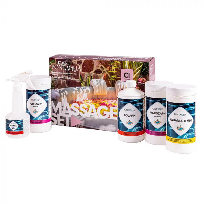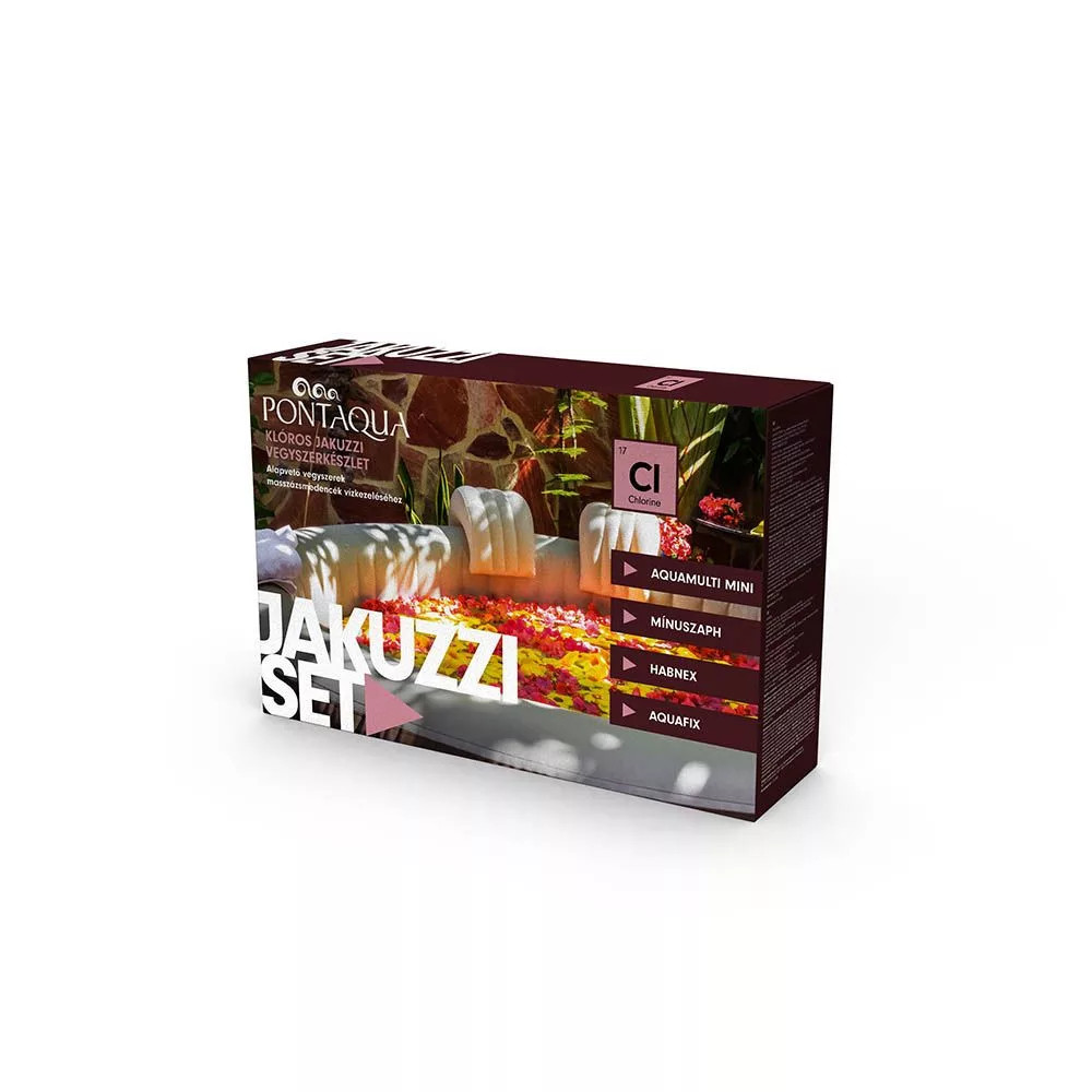 Klóros masszázs vegyszerkészlet masszázsmedencék klóros vízkezeléséhez. A csomag tartalma: AQUAMULTI MINI 1 kg - lassan oldódó kombinált hatású klórtabletta 20 g Tartalom: Triklórizocianursav 97,5% CAS Nr: 87-90-1, EU Nr: 201-782-8 AQUFIX 1l -Réz-szulfát 2,5%, CAS Nr: 7758-98-7, EU Nr: 231-847-6 OTH engedélyszáma: OTH-3926-2/2008. MÍNUSZAPH 1,5 kg - pH értéket csökkentő vegyszer Tartalom: Nátrium-hidrogén-szulfát 100%, CAS Nr: 7681-38-1, EU Nr: 231-665-7 HABNEX 0,5 l - habképződést megakadályozó, és a képződő habot eltávolító szer Tartalom: alfa-oktadecil-omega-hidroxi-poliglikol-éter 1,5-1,7%