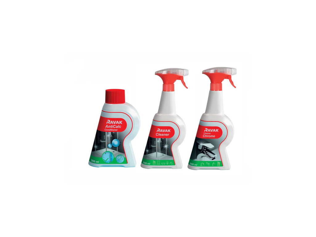 Ravak tisztítószer csomag, amely tartalmazza a Ravak AntiCalc Conditioner-t, a Ravak Cleaner-t és a Ravak Cleaner Chrome-ot.