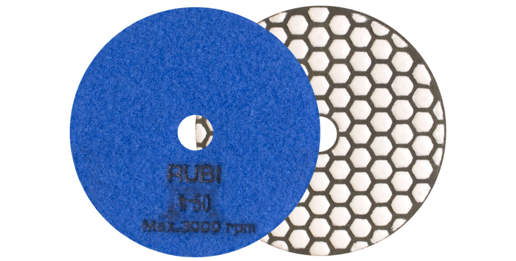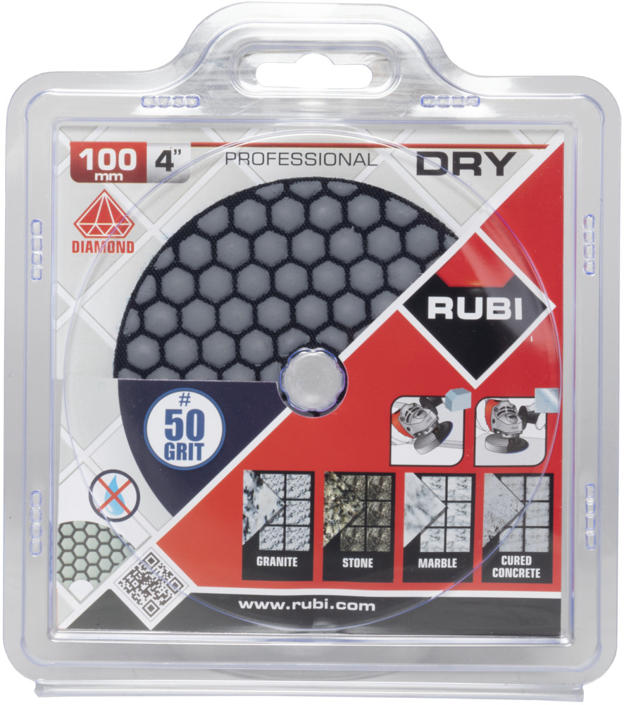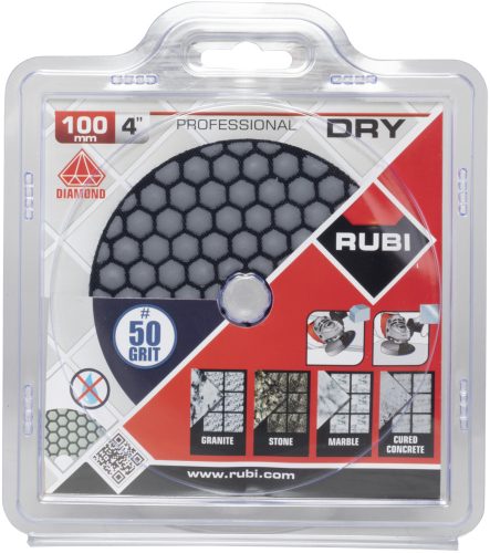 A Rubi száraz gyémánt csiszolókorong 100 mm GR‑50 (62970) durva szemcseméretű (#50) polírozó- és csiszolókorong, amely természetes kövek, márvány, gránit és beton felületeinek száraz megmunkálására készült.