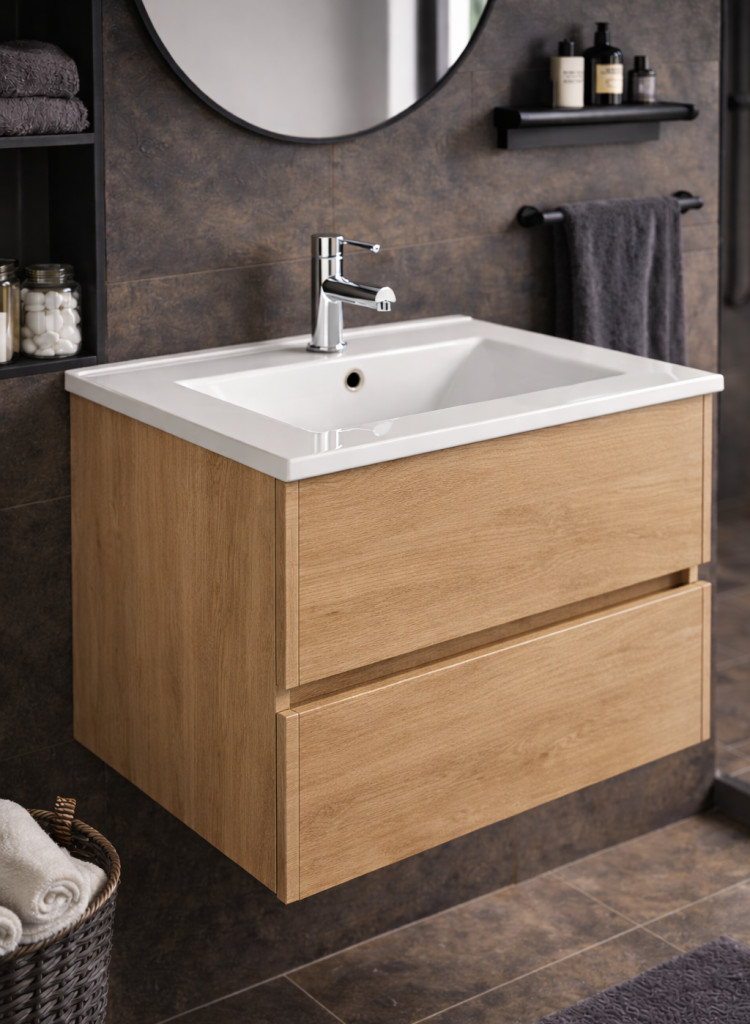 A TBOSS Sparta alsószekrény kerámia mosdóval ideális választás modern fürdőszobákba, ahol a letisztult design és a praktikum találkozik. Az elegáns natúr tölgy és a szögletes formavilág időtálló megjelenést biztosít, míg a falra szerelhető kivitel könnyed, lebegő hatást kelt.
