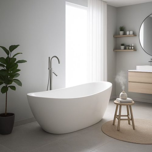 Emelje fürdőszobája stílusát ezzel a prémium minőségű, szabadon álló akril káddal, amely a letisztult formavilágot és a luxus kényelmet ötvözi. Ívelt, ergonomikus kialakítása tökéletesen követi a test vonalát, így a fürdés igazi pihenéssé és feltöltődéssé válik.