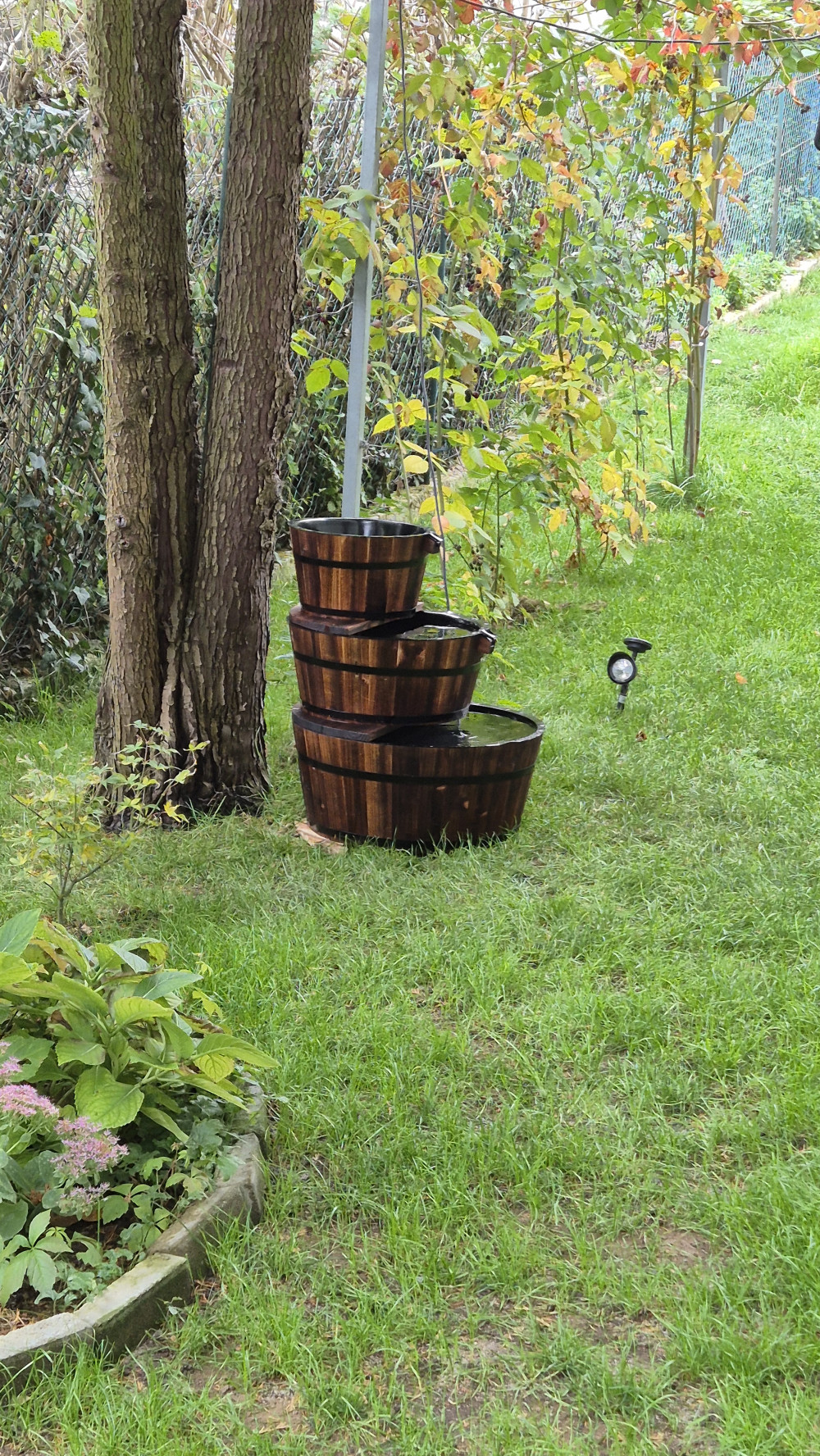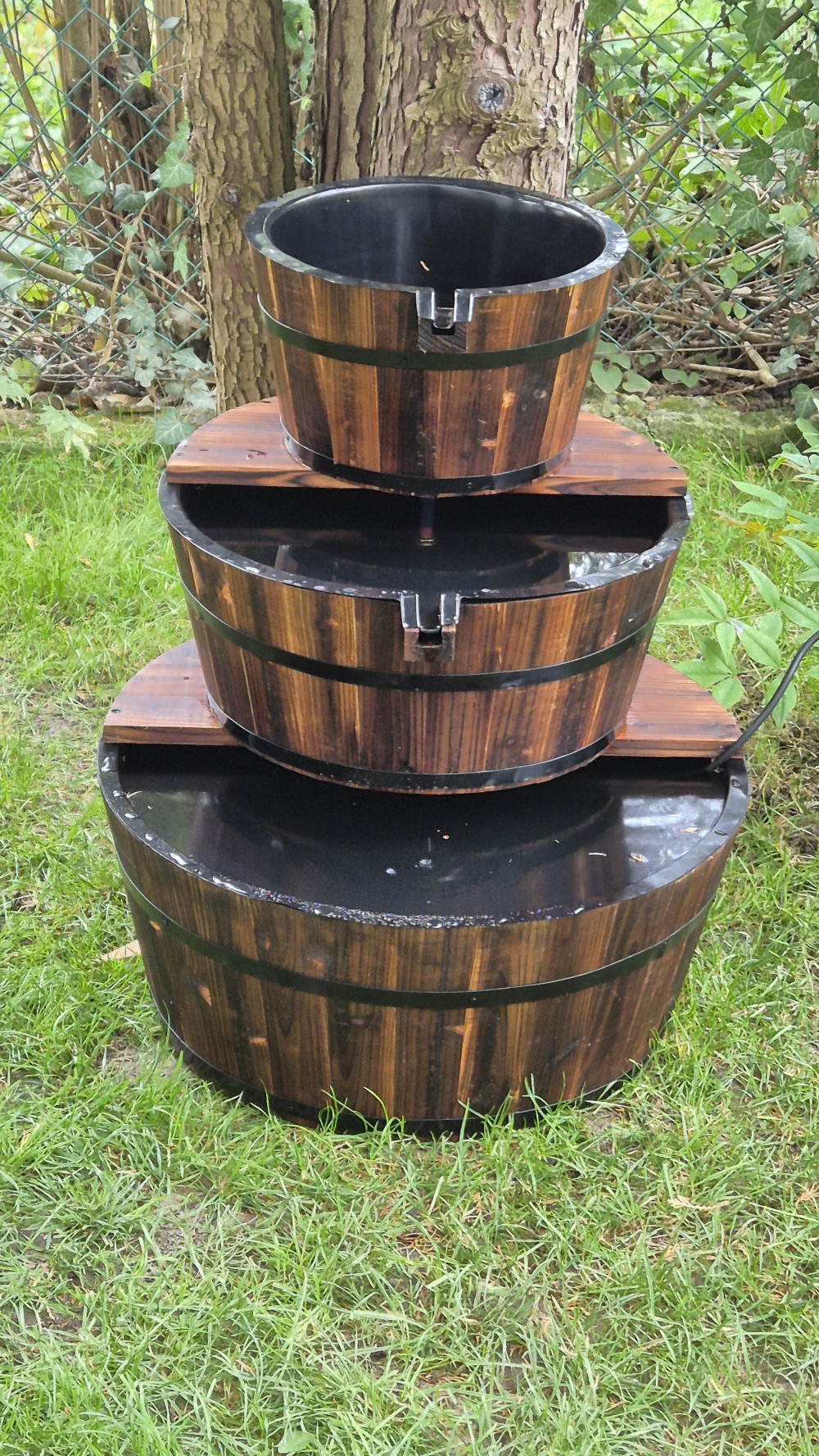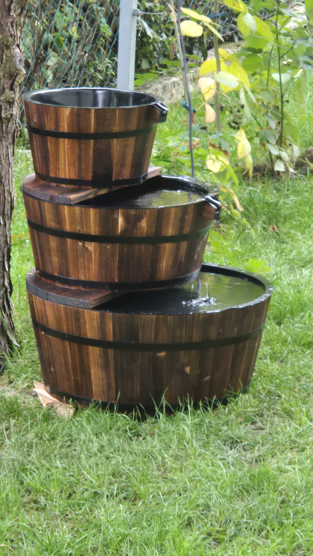 Kerti csobogó szett Edinburgh Rusztikus kertek stílusos kiegészítője az EDINBURGH csobogó Szinte minden típusú kertbe jól illik, különösen virágoskertek közelében mutat jól.  Komplett szett, mely mindent tartalmaz, ami a csobogó azonnali használatba vételéhez szükséges. Összeállításához a helyszín kiválasztása és előkészítése után csupán egy-két óra szükséges. A csobogó elhelyezhető teraszon vagy más, kövezett, járólapozott, betonozott vagy faborítású felületen.  Önálló egységet alkot, nincs szükség semmi másra, mint egy hálózati csatlakozó helyre a felállításához. Adatok: A tálak méretei: 32, 46 és 59 cm átmérő A csobogó magassága: 72 cm Anyaga: Fa edények, műanyag belsővel Tartozékok: 600 l/H teljesítményű szivattyú Csatlakozók Csobogó felépítmény ellemzők: Elhelyezhető felszín felett (teraszon, lépcsőn, járdán) Virágágyások közelében különösen kellemes látvány